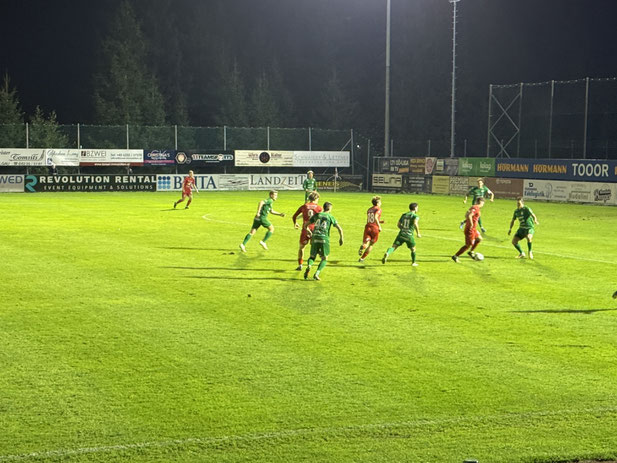 Vor gut 200 Zuschauern entwickelte sich zunächst ein Kräftemessen, welches nicht gerade mit einer Vielzahl an Torraumszenen und echten Highlights aufwartete. Angesichts der Ausgangssituation der beiden beteiligten Mannschaften konnte dies aber auch nicht gerade erwartet werden. Nichtsdestotrotz dauerte es nur rund vier Minuten, als Marco Hödl die erste vielversprechende Möglichkeit für den Gastgeber verbuchte, diese jedoch noch ungenützt verstreichen ließ. In weiterer Folge spielte sich das Geschehen dann vorrangig im Mittelfeld des Rasens ab, ehe nach einer guten Stunde das runde Leder dann schlagartig im Netz zappelte. Dafür verantwortlich: Die Mannen vom Mondsee, die durch einen wuchtigeg Kopfballtreffer von Maximilian Grössinger nach einem Eckball in Minute 32 in Führung gingen und so den Tabellenletzten ein erstes Mal an diesem Abend so richtig schockten. Eine adäquate Antwort konnte der Liga-Dino auf jeden Fall vor der Pause nicht mehr geben.